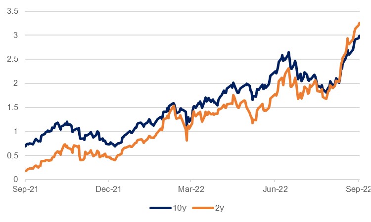 The Bank of England’s stance will be key in the coming months and quarters, and the market is currently pricing a further 150bps of hikes through Q1 2023 to 4%, much higher than analysts currently expect given the worsening economic outlook. The bank might well act more firmly as it looks to balance the changing fiscal outlook and its potential impact on inflation, but with UK rates likely to remain lower than those of the US, we expect that sterling will remain under pressure.