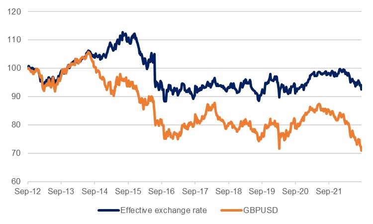 The worsening growth outlook and fiscal position is being reflected in the fixed income market – 10yr gilt yields have risen 113bps since the start of August – and in the currency market, as sterling has been steadily weakening against the dollar, falling to multi-decade lows in recent sessions. Much of this is as much a dollar strength story as it is inherent GBP weakness – EUR, JPY and other majors have also weakened against USD, and the pound’s effective exchange rate, while weakening, is arguably within the post-Brexit range still – but the upside for the currency is certainly limited at present with public debt levels rising, inflation set to remain high, and a deteriorating growth outlook as the energy crisis bites on both households and businesses. Sterling enjoyed a 0.5% bounce against the greenback yesterday but remains low compared to long-run averages.