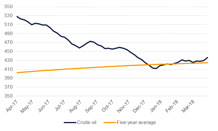 Crude inventories in the US built at a rapid pace last week, up more than 6.2m bbl. While the overall level continues to bump along the five-year average of around 430m bbl, this week’s increase shows that some mega builds are still possible. Gasoline stocks rose 1.2m bbl while overall refinery input declined.