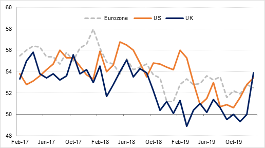 The Eurozone services PMI also came in ahead of forecasts at 52.5, but down from 52.8 in December, while the composite PMI rose to 51.3 from 50.9. However retail sales contracted by a larger than expected -1.6% m/m in December indicating a sharp slowdown in consumption in the bloc in Q4 2019. In contrast, UK data continues to surprise on the upside suggesting that the economy is improving now that some of the political uncertainty has been resolved. The services PMI rose to 53.9 in January, a full point higher than forecast and up sharply from December’s 50.0, while the composite PMI rose to 53.3 from 49.3 in December.