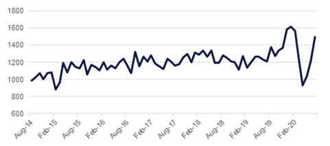 As a further sign of economic activity returning to normal, residential housing starts in the US rose more than 22% to 1.5m in July, their best performance since October 2016. The data far outstripped market expectations and the prior month’s level of 1.2mn. Applications for building permits, a better forward-looking figure, also performed well, rising by almost 19% to 1.5mn. Lower interest rates in the US are feeding through to the retail level, easing the costs of mortgage and construction. However, there has been a surge in mortgage delinquencies as job losses or pay cuts take their toll on the economy. Mortgage delinquencies in the US as a share of total loans spiked to over 8% in Q2, compared with just 4.4% in Q1 and less than 4% at the end of 2019. During the peak of the financial crisis delinquencies account for around 10% of total mortgage borrowing.