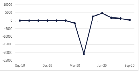 The US Labor Department’s employment report showed nonfarm payrolls added 661,000 jobs last month, the smallest gain since the jobs recovery started in May, after increasing 1.489 million in August. Every sector added jobs, except the government sector, which shed 216,000 jobs because of the departure of temporary workers hired for the census and as a shift to online learning in schools resulted in layoffs at state and local government education departments. Employment in the leisure and hospitality sector accounted for nearly half of the gain in nonfarm employment rising by 318k. Payrolls are 10.7mn below their pre-pandemic level, with just over half of the 22.2mn jobs lost during the pandemic being recouped. Employment growth peaked back in June when payrolls jumped by a record 4.8mn jobs. There were 3.8mn people who had lost their jobs permanently, up 345k from August. The unemployment rate fell to 7.9% in September from 8.4% in August as 695k people left the labor force.