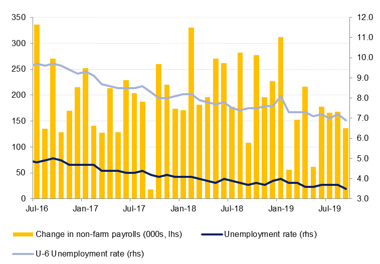 US payrolls data for June provided some relief for equity markets. While the figures indicated that growth was slowing in the US, they did not point to an imminent recession. Non-farm payrolls rose by 136k in September, lower than the 145k that the market had expected, but the August reading was revised higher to 168k from 130k previously. Encouragingly, the unemployment rate declined to a 50-year low of 3.5%. However, average hourly earnings growth was the slowest in fourteen months at 0% m/m and 2.9% y/y. The September jobs numbers partly offset disappointing manufacturing and services data that was released earlier last week. The minutes from the Fed’s last meeting will be released on Wednesday, and Chairman Powell and other members of the FOMC are all due to speak this week. The market will be closely watching these comments for clues about the timing of the Fed’s next rate cut, following the latest payrolls data. The market is pricing a 73% probability of a cut in October but the last DOT plot indicated a wide range of views among FOMC members about the future direction of monetary policy.