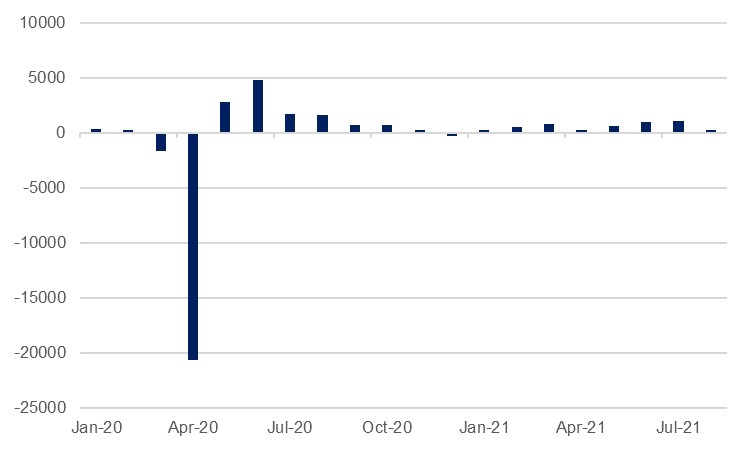The latest non-farm payrolls print for August disappointed markedly to the downside. Showing a net gain of just 235,000, it was some half a million short of consensus projections and marked a considerable slowdown from the previous month’s 1.05mn. Some of this slowdown can be directly attributed to the ongoing pandemic crisis in the US; the Delta variant saw new case numbers soar to an average of 136,000 a day last month, and it was retail and hospitality, the sectors most likely to be affected by the virus, that showed the weakest performance in the August jobs report. There have also been arguments that the mismatch in August was down to the pandemic-related support packages that remained in play, with people reluctant to return to work while they could still rely on this income. With these benefit packages having largely expired in September, it will be interesting to see if there is a marked acceleration in the NFP figure for this month, but the evidence from those counties that removed the support early suggests that it was not the determining factor in the slow take-up of jobs. Childcare issues may also have been a factor, and with most schools having now returned to in-person teaching (the recent surge in cases has forced a reversal in this process in some districts) this should be alleviated also.