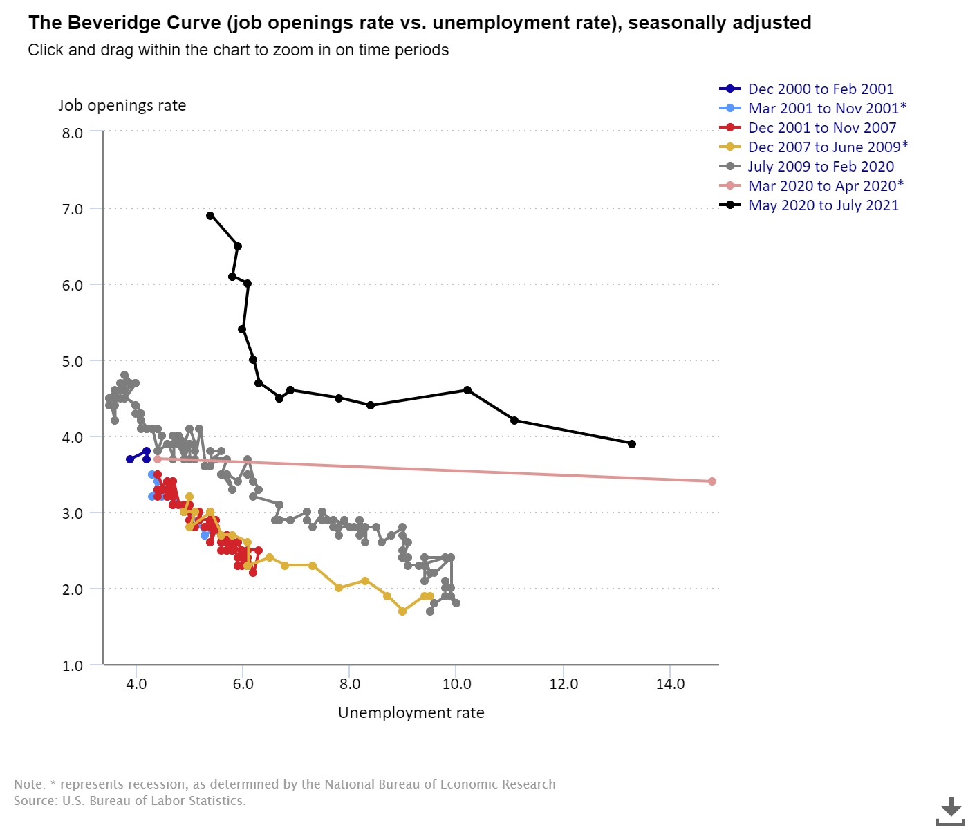 However, the evidence suggests that there is more to the mismatch than simply concerns over catching Covid-19 that is forestalling the recovery in total employment levels (still 5.3mn fewer jobs than there were prior to the pandemic). While the headline U-3 unemployment rate is falling after spiking to 14.8% in April 2020 (the US did not implement the kind of furlough schemes seen elsewhere which kept the jobless rate lower in countries such as the UK) it remains fairly high at 5.2%, even while job openings have risen to a record 10.9mn. This has seen the Beveridge Curve, which plots openings against joblessness, shift markedly outwards up and to the right when compared to previous economic crises (see chart below), suggesting that there has been a serious deterioration in the matching efficiency of the US labour market. Some of this is due to those factors mentioned above, but there has also been a rising number of people opting out of the labour market altogether.
