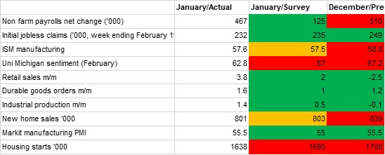 A round-up of the most widely followed monthly macro data points from the US, compared to expectations and the previous month's results.