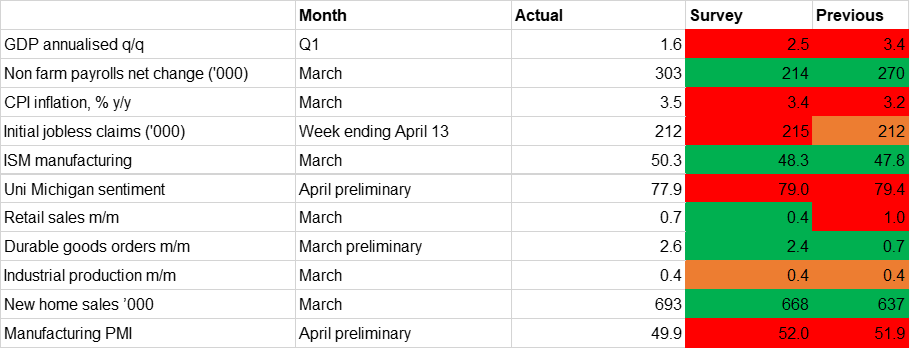 Some monthly indicators are showing signs that the ongoing tight monetary policy stance is weighing on activity. Durable goods orders were up 2.6% m/m in March, but this was driven by a sharp rise in new orders at Boeing. Stripping out the volatile transportation component of the measure, growth was just 0.2% – in line with expectations but still evidence of some reticence by businesses to invest with interest rates elevated and some political uncertainty related to the upcoming elections later this year. New home sales picked up to a six-month high of 693,000 in March, from 637,000 the previous month, but this remained below the five-year average (719,250) and was supported by incentives from housebuilders. Existing home sales declined to 4.2mn, from 4.4mn in February, with high mortgage rates discouraging sellers from moving away from their existing low-rate deals.