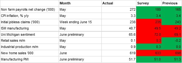 On the production front, data continues to be mixed, and while the prints have been coming in stronger this year than last, manufacturing generally has continued to underperform. The ISM manufacturing survey fell to 48.7 in May, down from 49.2 the previous month and undershooting predictions that it would rise to 49.5. March this year was the only month that the reading has been in positive territory since late-2022. The S&P Global manufacturing PMI remains stronger, however, and it printed better than the previous month and expectations, while there was a 0.9% m/m surge in industrial production as hotter weather boosted utilities output.