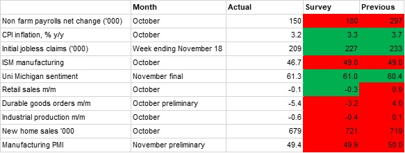 Higher rates are starting to impact the monthly data releases more meaningfully, and retail sales declined 0.1% m/m in October, compared with a 0.9% expansion the previous month. New homes sales have also continued to decline, dropping to 679,000 (annualised) in October, down from 719,000 the previous month, as high mortgage rates have constrained demand. Meanwhile, business investment has also deteriorated in the high rates environment as durable goods orders declined by a greater-than-expected -5.4% m/m in October. This was skewed by the transportation sector and the UAW strike, but stripping these out, growth was flat in October while September’s growth was just 0.2%.