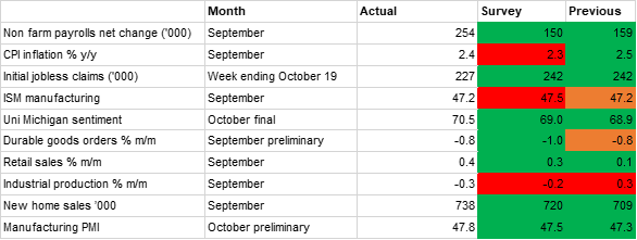 Elsewhere in the data the production side of the economy continued to be the underperformer, as has been the case all year. The preliminary S&P Global manufacturing PMI for October did beat the previous month and expectations, but it was nevertheless below the neutral 50 line for the fourth month in a row. The ISM manufacturing survey for September was unchanged on the previous month at 47.2 but missed the predicted 47.5. This marked the sixth consecutive sub-50 reading for the index. Meanwhile, industrial production contracted 0.3% m/m, and was our only indicator that both missed expectations and deteriorated compared with the previous reading.
