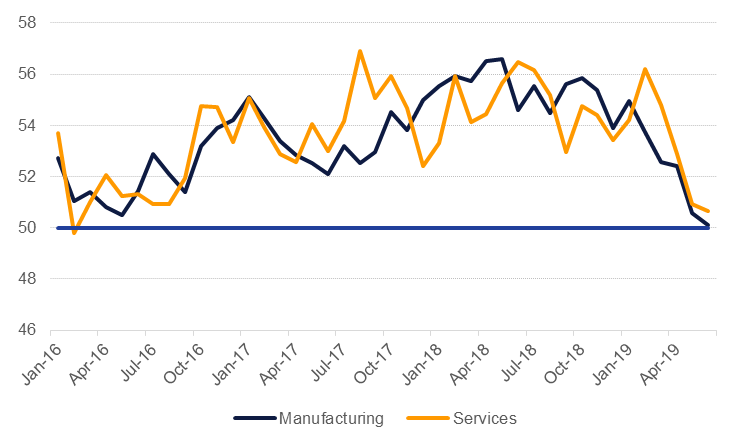 The US manufacturing PMI weakened to just 50.1 in its June print, barely holding above the neutral 50 level. The PMI figure was a slowdown from 50.5 only a month earlier and much healthier levels of around 55 for much of the last 18 months. The deterioration in trade relations between the US and China will be weighing on business attitudes toward growth and will start to feed in higher input costs as US firms pay the cost of higher tariffs, not China as the US president appears to believe. All eyes on the upcoming G20 meeting at the end of the week will be fixated on dialogue between Donald Trump and Xi Jinping, his Chinese counterpart, as to whether trade talks will resume. While an all-encompassing trade deal is not likely to emerge this week, some kind of positive engagement will provide relief to markets. We would caution though that for President Trump, maintaining a hawkish stance on China trade issues will be a popular political agenda during his 2020 reelection bid.