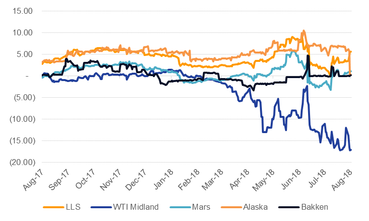 Earlier this week the EIA published its Drilling Productivity Report where it expects further increases in production in all shale basins for September. Total shale production will hit 7.5m b/d next month, nearly 70% of total US output. The Permian basin alone will provide 3.4m b/d even with physical pricing still remaining at a sharp discount to WTI (USD 17/b overnight).