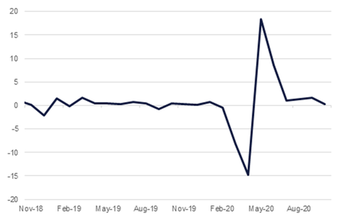 Despite the optimism prevalent following positive vaccine trial results over the past two weeks, data out of the US continues to highlight that the economic recovery remains fragile. As coronavirus cases climb rapidly, many states are imposing new checks on activity; yesterday California implemented an ‘emergency break’, reimposing many restrictions, and New Mexico began a new two-week lockdown. With no fiscal support on the horizon, the fourth quarter will be a difficult one for US consumers as jobs in the hospitality and retail sectors are hit once more, and this has already been illustrated by retail sales data released yesterday. Retail sales growth in October fell to a six-month low of 0.3% m/m, compared to a downwardly revised 1.6% in September. Consumption had held up surprisingly well to now, but with permanent job losses rising, and the potential for a renewed rise in temporary job losses, it could come to weigh on the economic recovery more broadly. In this regard, US policymakers can take some solace from the industrial production figures also released yesterday, which actually expanded 1.1% m/m in October following a 0.4% contraction the previous month. Manufacturing’s 1.0% gain was the sixth month of growth in a row.