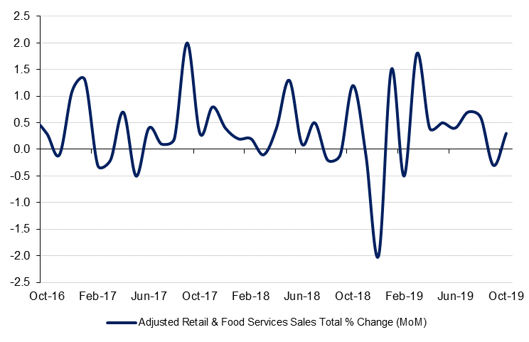 Mixed economic data out of the US on Friday revealed that despite slowing to trend, the US economy remains healthy in comparison to its developed counterparts. A rise in gasoline and motor vehicle prices helped retail sales climb 0.3% m/m in October, following a 0.3% m/m decline the previous month. This expansion was greater than the 0.2% m/m expected by the market and shows that while consumption is slowing, it its only slowing gradually. Given that Q3 personal consumption grew at 2.9% annualized, this report indicates that Q4 consumption is likely to remain solid.
