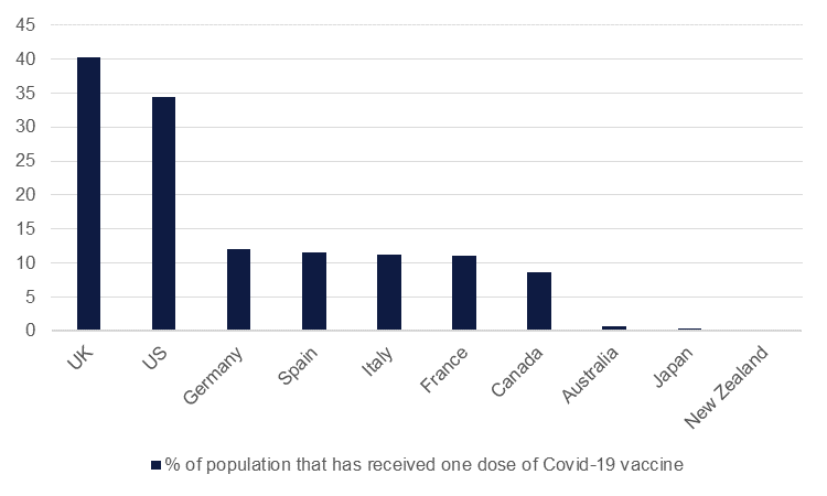Vaccination programmes across major EU members are proceeding at a halting pace, particularly when compared with the UK or US. Germany has had the most success among the large EU economies but has so far provided less than 12% of its population with a dose of a Covid-19 vaccine compared with nearly 40% in the UK and almost 35% in the US. France, Spain and Italy are all lingering at around 12% of their population having received a dose.