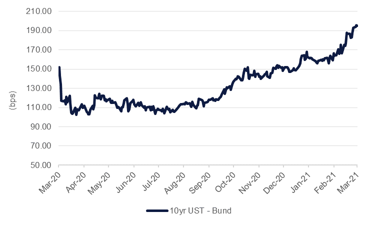 Growth differentials are widening considerably in favour of the US relative to the Eurozone along with a sizeable deterioration in 10yr nominal bond spreads that favour USTs over bunds. We do believe that the bearishness in UST markets is a little overwrought at present but a wide yield differential in favour of USTs vs Eurozone bonds remains sound given the economic divergence between the two.