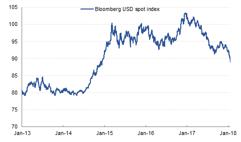 The USD index reached its lowest level in three years after Treasury Secretary Steve Mnuchin signalled that a weaker USD would be good for the US economy, and concerns about US protectionism increased this week. President Trump is expected to reinforce this view when he speaks at the World Economic Forum in Davos tomorrow. The Bloomberg dollar index is down more than -13.5% since the start of 2017, and -3.5% this month alone.